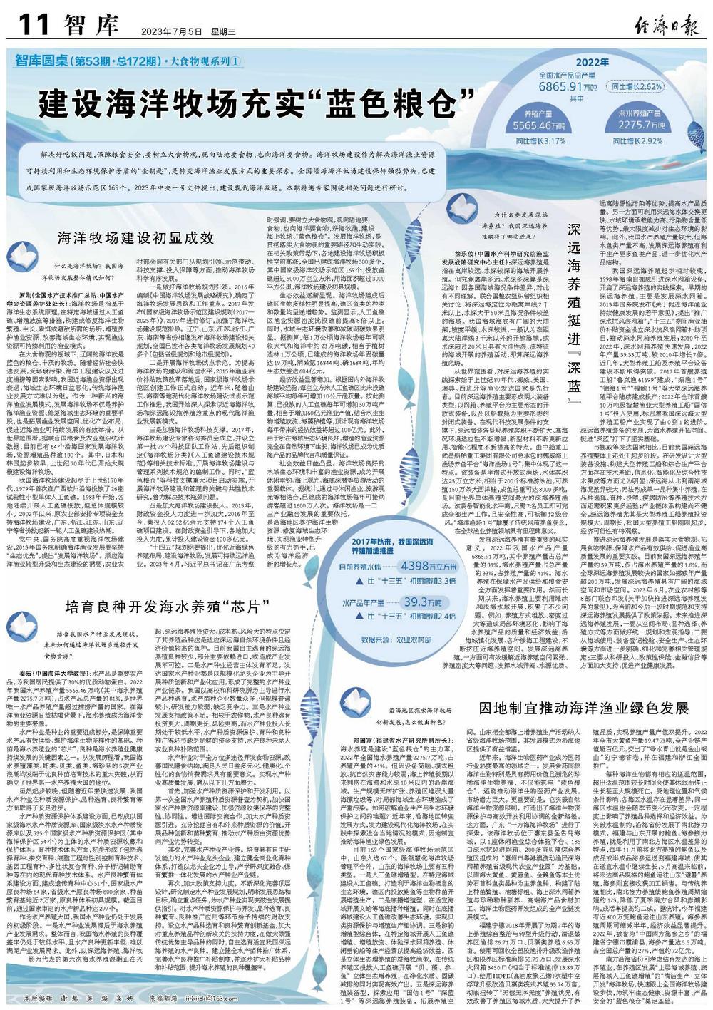 秦宏(中国海洋大学教授):水产品是重要农产品,为我国居民提供了30%的优质动物蛋白。2022年我国水产养殖产量5565.46万吨(其中海水养殖产量2275.7万吨),占水产品总产量的81%,是世界唯一水产品养殖产量超过捕捞产量的国家。在海洋渔业资源日益枯竭背景下,海水养殖成为海洋食物的主要来源。