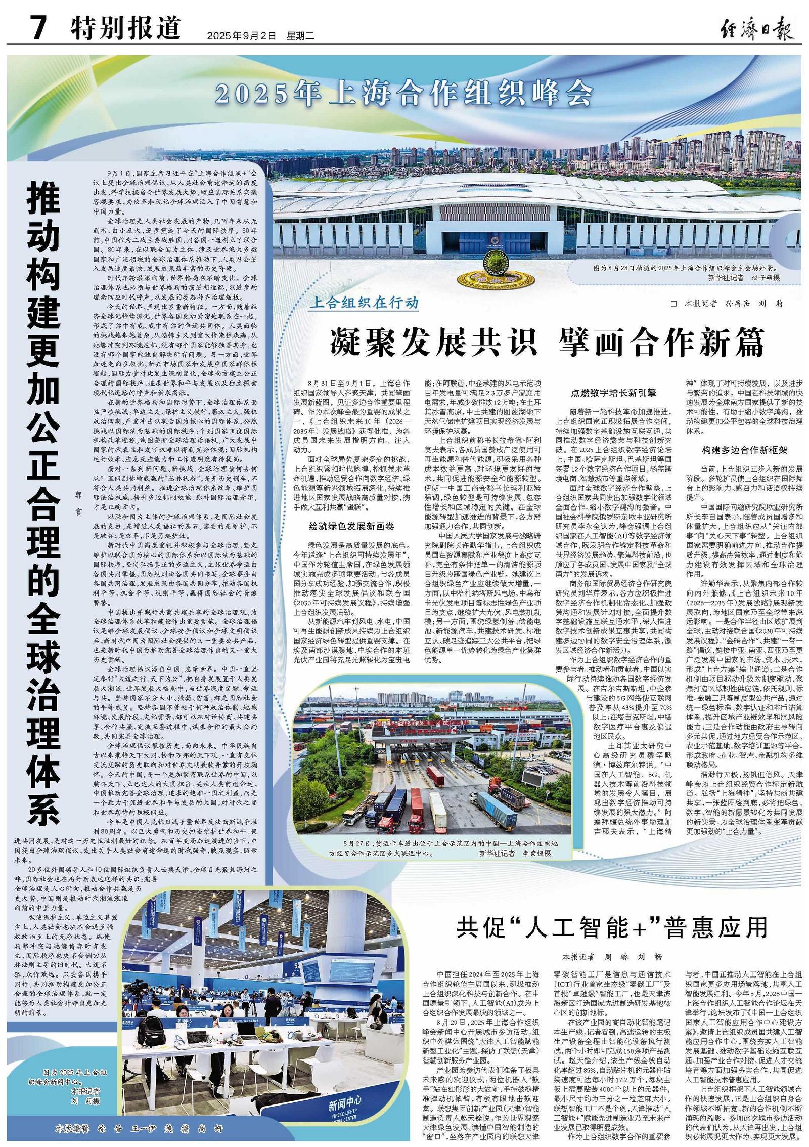 浩渺行无极,扬帆但信风。天津峰会为上合组织经贸合作标定新航道。弘扬“上海精神”,坚持共商共建共享,一张蓝图绘到底,必将把绿色、数字、智能的新愿景转化为共同发展的新实景,为全球治理体系变革贡献更加强劲的“上合力量”。