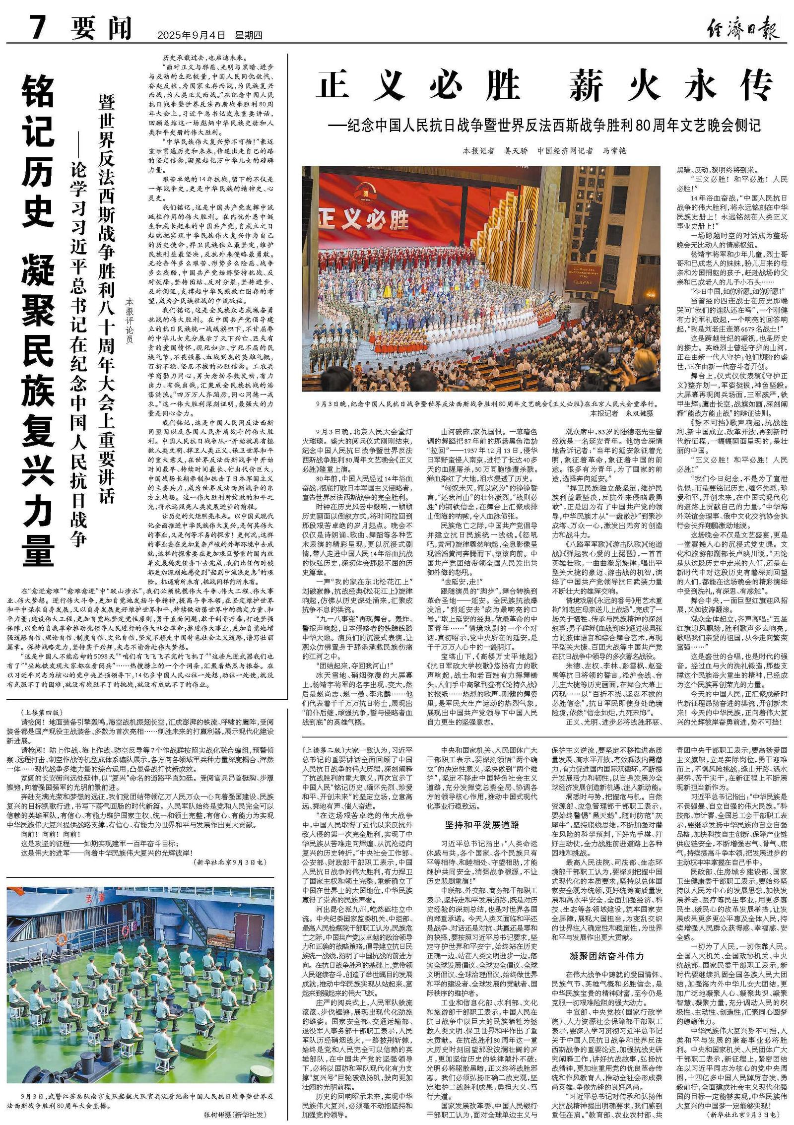 9月3日晚,北京人民大会堂灯火璀璨。盛大的阅兵仪式刚刚结束,纪念中国人民抗日战争暨世界反法西斯战争胜利80周年文艺晚会《正义必胜》隆重上演。