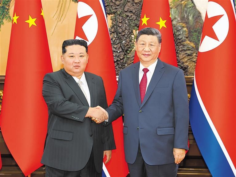 习近平指出,中朝是命运与共、守望相助的好邻居、好朋友、好同志。中朝友谊源远流长,两国都是共产党领导的社会主义国家,有着共同的理想信念和奋斗目标。金正恩总书记来华出席纪念中国人民抗日战争暨世界反法西斯战争胜利80周年活动,体现了朝方维护二战胜利成果的坚定意志,也为中朝两党两国进一步发展友好合作关系提供了重要契机。