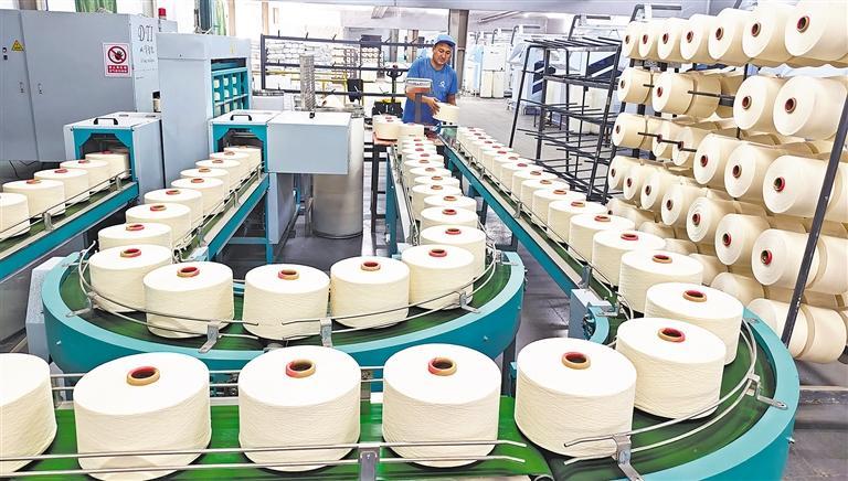 近日,新疆精一纺织科技有限责任公司开足马力生产纺纱订单产品,销往浙江、广东等地,满足市场需求。图为公司工人在纺织车间作业。包良廷摄(中经视觉)