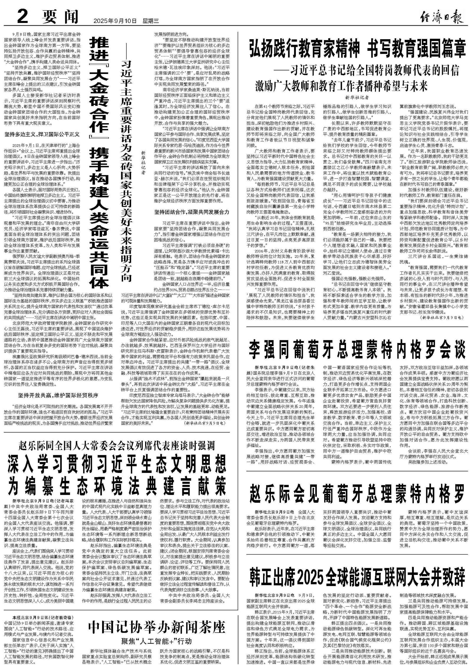 新华社北京9月9日电(记者冯家顺)中共中央政治局常委、全国人大常委会委员长赵乐际9日下午同列席十四届全国人大常委会第十七次会议的全国人大代表座谈交流。他强调,要深入学习贯彻习近平生态文明思想,发挥人大代表在立法工作中的作用,为编纂生态环境法典建言献策,凝聚立法共识、提高立法质量。