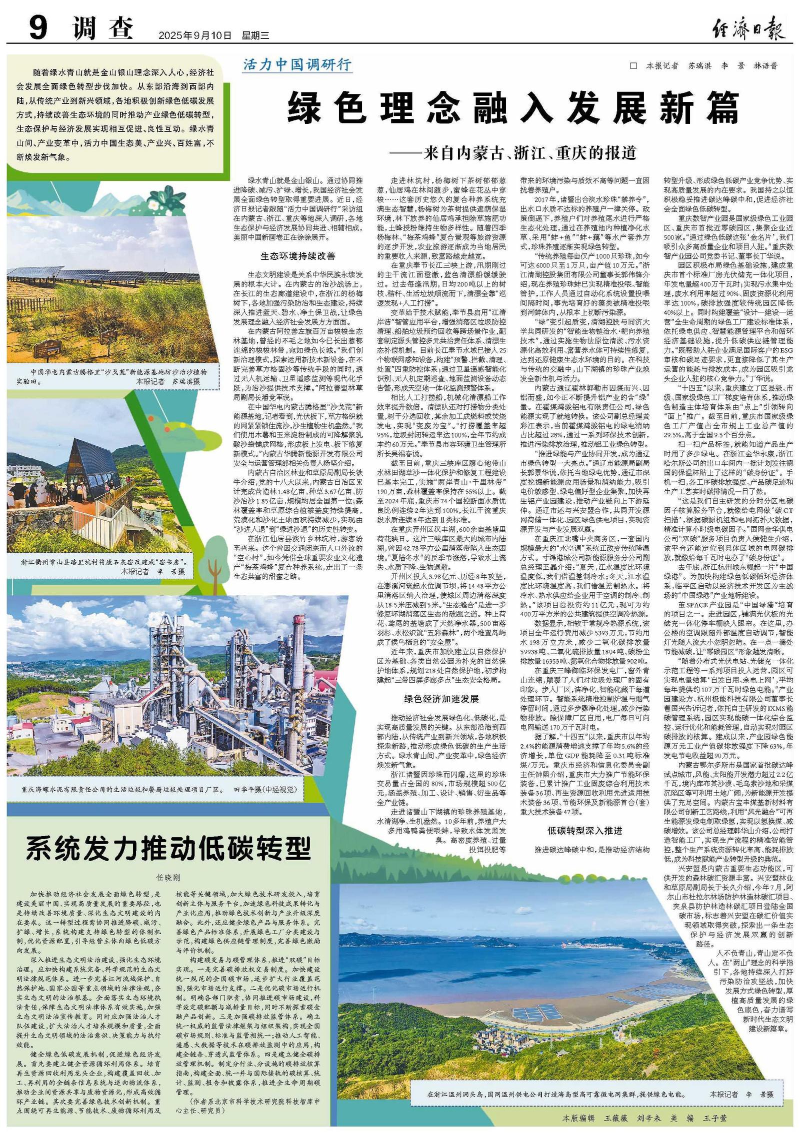 绿水青山就是金山银山。通过协同推进降碳、减污、扩绿、增长,我国经济社会发展全面绿色转型取得重要进展。近日,经济日报记者跟随“活力中国调研行”采访组在内蒙古、浙江、重庆等地深入调研,各地生态保护与经济发展协同共进、相辅相成,美丽中国新画卷正在徐徐展开。