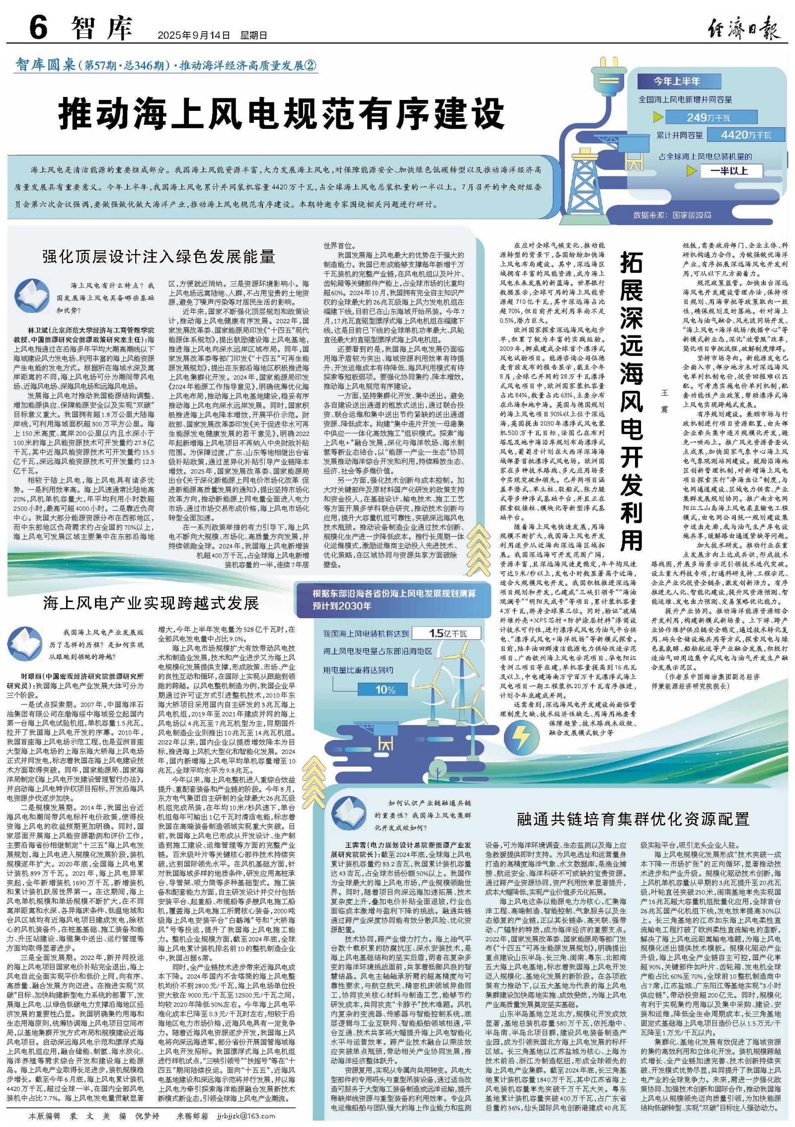 规范政策监管。加快出台深远海风电开发建设管理办法,保持项目规划、用海审批等政策取向一致性,确保规划及时落地。针对海上风电与油气融合、风光波同场开发、“海上风电+海洋牧场/数据中心”等新模式新业态,深化“放管服”改革,简化项目审批流程,破解制度障碍。