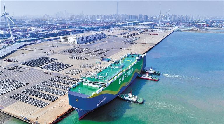 9月22日,靠泊在天津港环球滚装码头的甲醇双燃料动力汽车滚装船“港荣”轮,开始300吨国产绿色甲醇岸基加注,标志着天津港已具备规模化供应绿色甲醇能力。此次绿色甲醇加注成功落地,为“三北”地区新能源转化提供了距离最近的应用场景。马超洋摄(中经视觉)