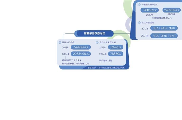 高质量发展是全面建设社会主义现代化国家的首要任务,全面建成社会主义现代化强国需要坚实的物质技术基础。新疆工作在党和国家工作全局中具有特殊重要的地位,事关强国建设、民族复兴大局。党的十八大以来,习近平总书记提出“治国必治边”“兴边富民、稳边固边”等重要论断,为加快边疆民族地区高质量发展提供了指引和遵循。新疆各族干部群众沿着习近平总书记指引的方向奋发有为,在经济社会发展各领域都取得了重大突破。困扰新疆数千年的绝对贫困问题得到历史性解决,新疆同全国一道全面建成小康社会;2024年地区生产总值同比增长6.1%、突破2万亿元大关;贸易规模持续提升,进出口总额在2022年、2023年、2024年分别跨越2000亿元、3000亿元、4000亿元大关。新征程上,新疆经济社会发展“稳”的基础更加牢固、“进”的动能显著增强、“新”的质效大幅提升。