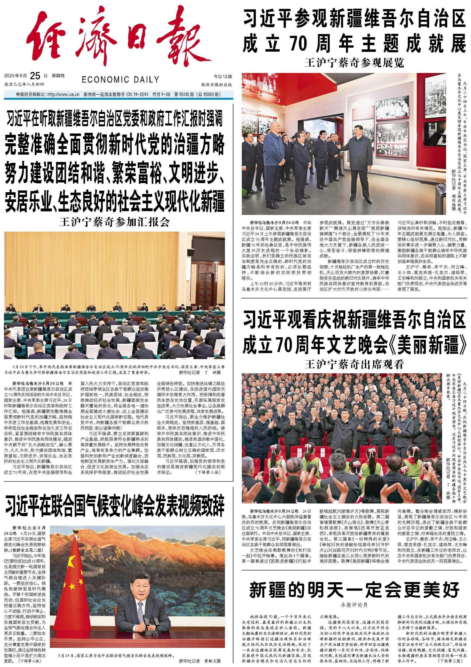 新华社乌鲁木齐9月24日电 率中央代表团出席新疆维吾尔自治区成立70周年庆祝活动的中共中央总书记、国家主席、中央军委主席习近平,24日听取新疆维吾尔自治区党委和政府工作汇报。他强调,新疆要完整准确全面贯彻新时代党的治疆方略,坚持稳中求进工作总基调,统筹发展和安全,牢牢扭住社会稳定和长治久安工作总目标,紧紧围绕铸牢中华民族共同体意识、推进中华民族共同体建设,锚定中央赋予的“五大战略定位”,凝心聚力、久久为功,努力建设团结和谐、繁荣富裕、文明进步、安居乐业、生态良好的社会主义现代化新疆。