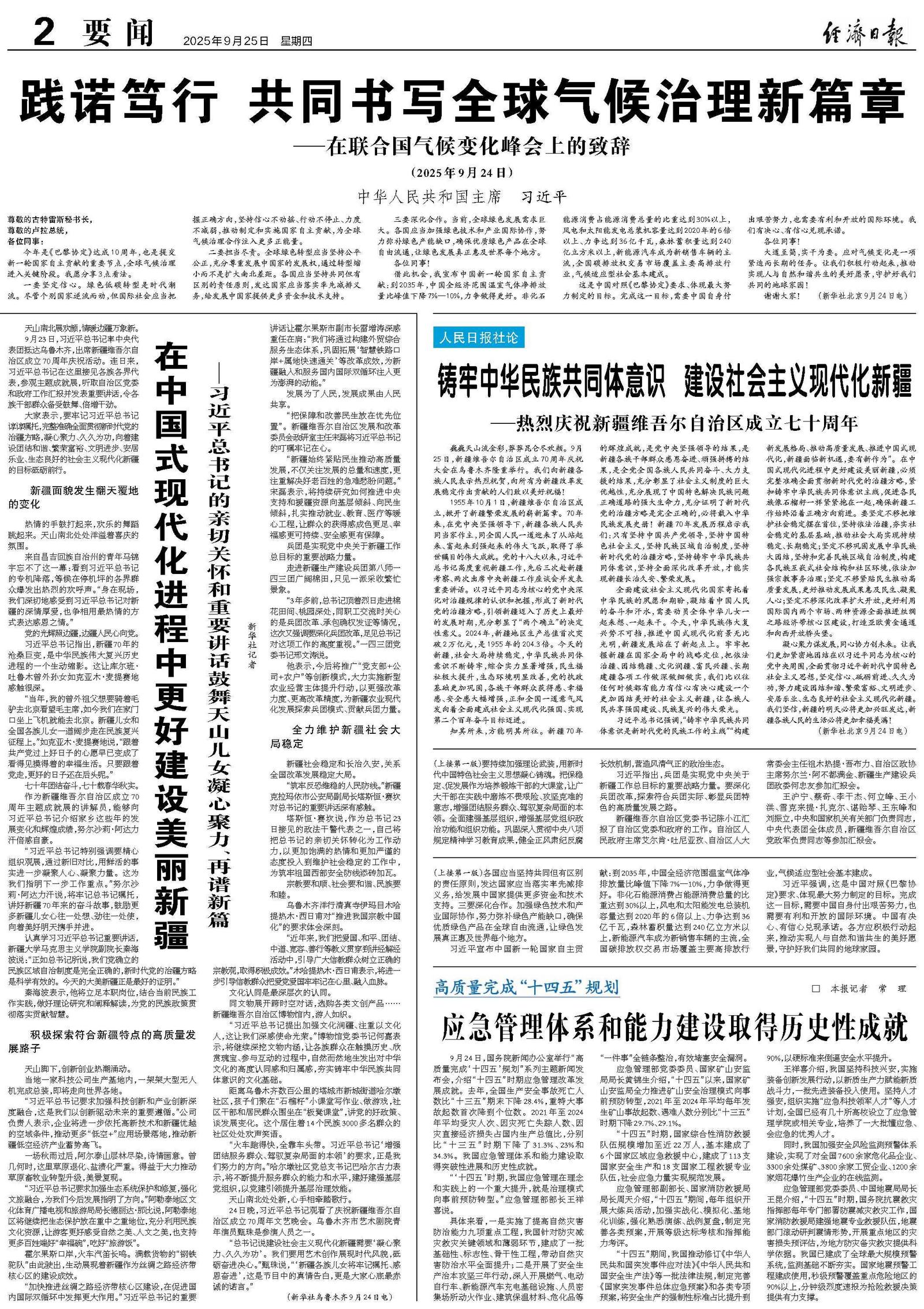 新华社乌鲁木齐9月24日电 率中央代表团出席新疆维吾尔自治区成立70周年庆祝活动的中共中央总书记、国家主席、中央军委主席习近平,24日听取新疆维吾尔自治区党委和政府工作汇报。他强调,新疆要完整准确全面贯彻新时代党的治疆方略,坚持稳中求进工作总基调,统筹发展和安全,牢牢扭住社会稳定和长治久安工作总目标,紧紧围绕铸牢中华民族共同体意识、推进中华民族共同体建设,锚定中央赋予的“五大战略定位”,凝心聚力、久久为功,努力建设团结和谐、繁荣富裕、文明进步、安居乐业、生态良好的社会主义现代化新疆。