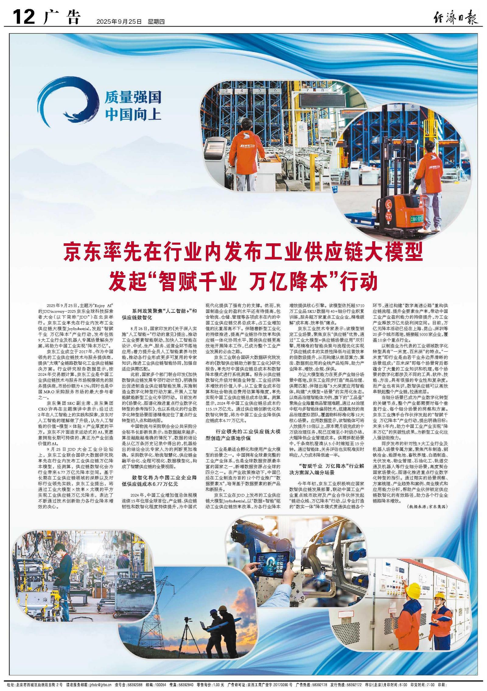 2025年9月25日,主题为“Enjoy AI”的JDDiscovery-2025京东全球科技探索者大会(以下简称“JDD”)在北京举行。京东工业率先在行业内发布工业供应链大模型JoyIndustrial,发起“智赋千业 万亿降本”产业行动,发布包括9大工业行业及机器人专属场景解决方案,将助力中国工业实现“降本万亿”。