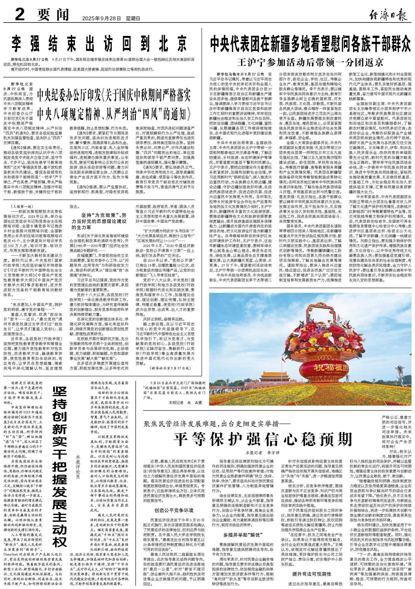 中共中央政治局委员、中央统战部部长、中央代表团副团长李干杰带领二分团来到克孜勒苏柯尔克孜自治州阿图什市,前往企业、学校、社区,考察企业生产、教育发展、基层治理和精细化服务群众等情况。李干杰表示,要以铸牢中华民族共同体意识为主线,教育引导各族群众树立正确的国家观、历史观、民族观、文化观、宗教观,不断巩固各民族大团结,像石榴籽一样紧紧抱在一起,让民族团结进步之花在天山南北常开长盛。新疆发展要落实到改善民生、惠及当地、增进团结上,必须紧紧围绕各民族安居乐业推进经济社会发展和民生改善,不断增强各族群众获得感、幸福感、安全感。