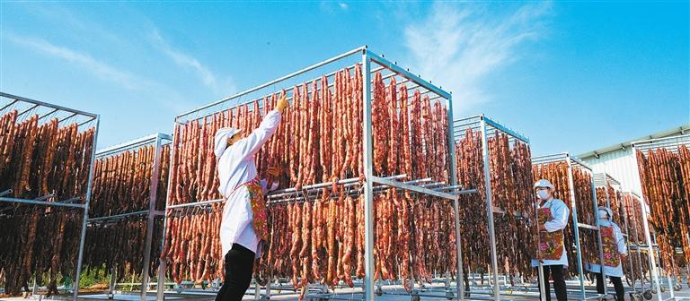 1月15日,四川省德阳市旌阳区妈仔食品有限责任公司晒场,员工在晾晒腊肠、腊肉、腊排等传统特色腊制品。