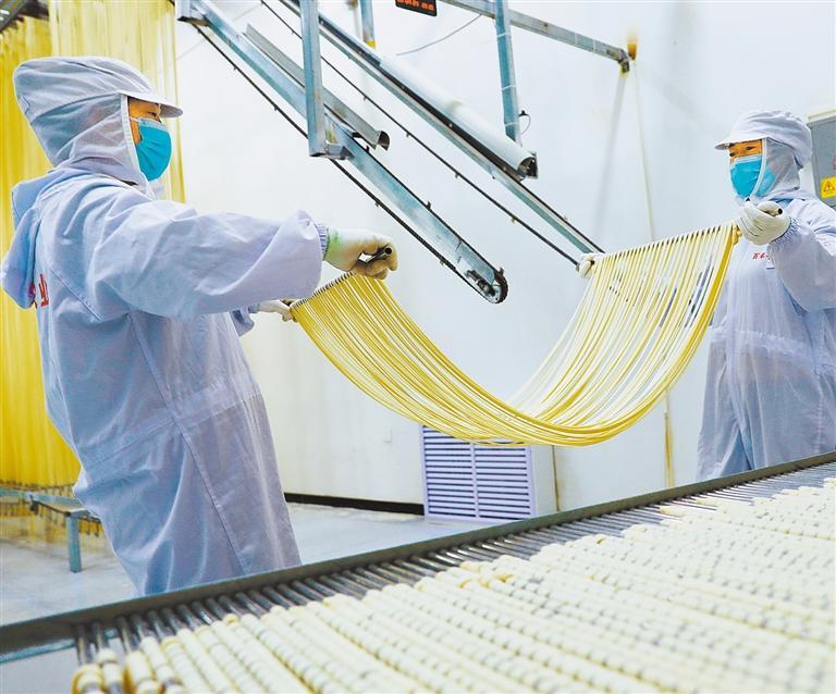 1月21日,在甘肃省张掖市民乐县雪麦农业产业发展有限公司手工挂面生产车间里,工人们正在加工传统手工挂面。作为乡村特色传统优势产业项目,民乐县通过推行“党支部+经济合作组织+农户”的联动模式,构建“线上+线下”多渠道销售体系,积极引导村民在家门口实现就业增收。王晓泾摄(中经视觉)