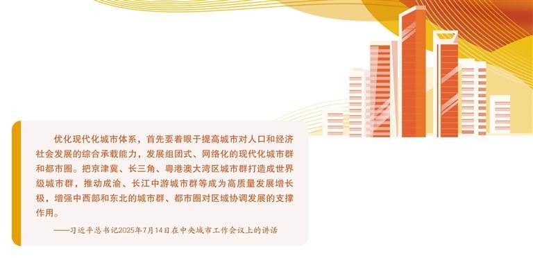 建强城市群和都市圈,优化城市空间格局。着力构建“城市群—都市圈—中心城市”为主体框架的多层级、网络化城市空间体系。持续提升京津冀、长三角、粤港澳大湾区三大城市群的高端要素汇聚能力、创新引领能力及产业迭代升级能力,打造具有全球影响力的世界级城市群;差异化推进成渝、长江中游、山东半岛等城市群发育成熟,打造具有辐射带动力的区域经济增长极,形成优势互补、梯度发展的城市群体系。加快城市群一体化和都市圈同城化,以基础设施互联互通为先导,强化交通、能源、信息等关键领域的一体化布局,构建“1小时通勤圈”“2小时经济圈”;以产业协同创新为支撑,建立跨区域产业协作平台,引导城市间形成“总部+基地”“研发+生产”等发展模式,提升产业链整体竞争力,推动城市群和都市圈从物理连接向功能融合升级。