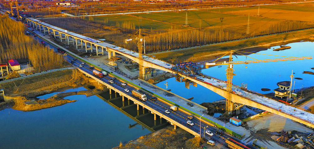 12月20日,小清河复航工程重点控制性工程之一——山东广饶S227河辛线特大桥正在紧张施工,其中跨小清河主桥已经成功合龙。小清河复航工程的建设实施,将形成山东第一条海河直达的高等级水运通道。刘云杰摄(中经视觉)