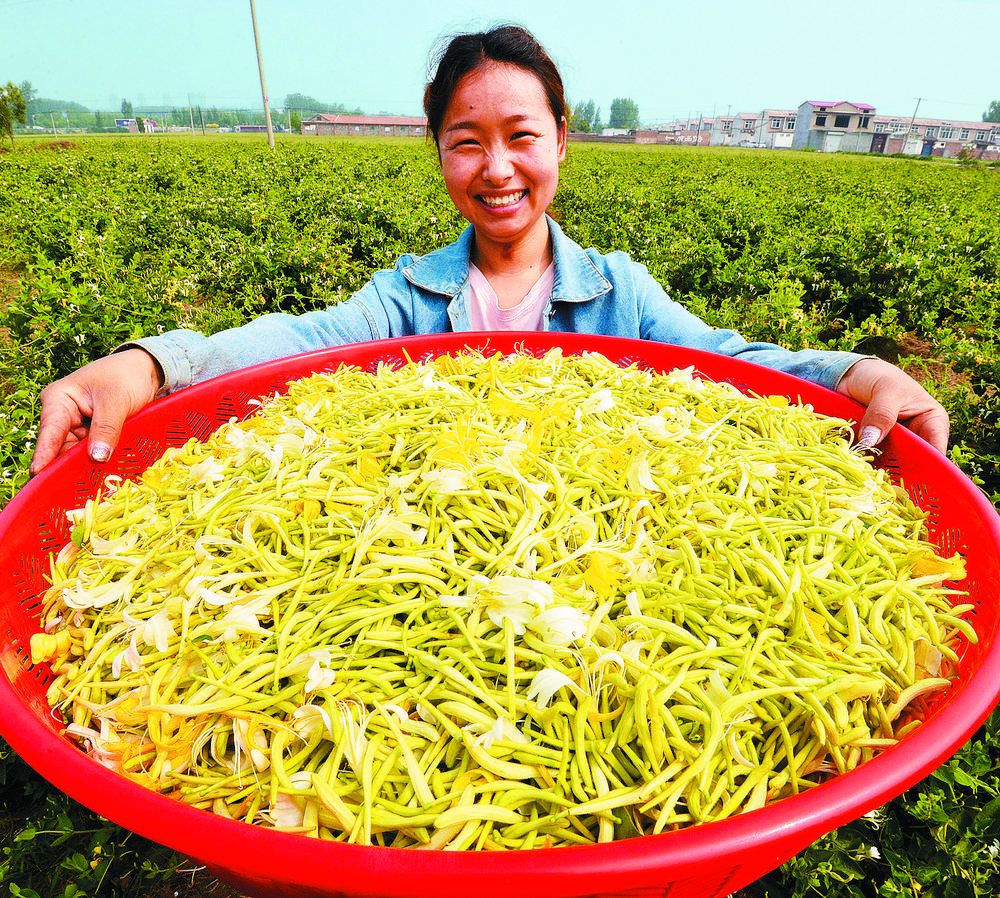 邯郸市磁县磁州镇东侯召村村民展示刚采收的金银花。该县大力发展金银花等中药材种植业,带动农民增收。