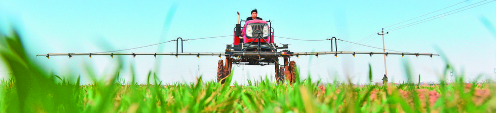 邯郸市肥乡区信益小麦种植专业合作社,员工驾驶植保机给麦田喷洒除草剂。邯郸是粮食生产大市,今年全市共完成冬小麦播种五百三十四万亩,比二〇二〇年增加八点七万亩。