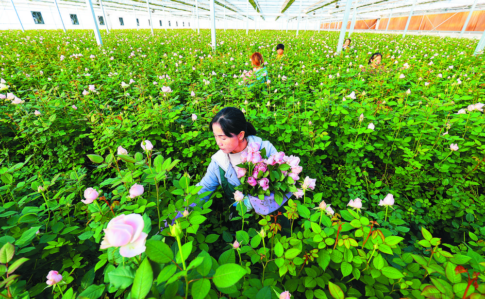 邯郸市邱县盛水湾玫瑰产业园,花农在采摘玫瑰花。该园区主要面向京津冀和长三角市场,全年可产鲜切花1500万枝,产值达3000万元。