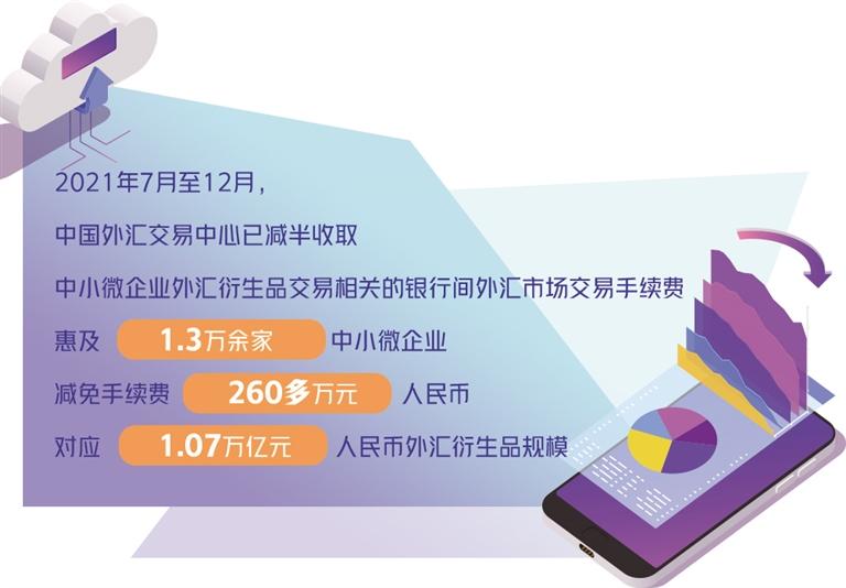 数据显示,2021年7月至12月,中国外汇交易中心已减半收取中小微企业外汇衍生品交易相关的银行间外汇市场交易手续费,惠及50家金融机构服务的1.3万余家中小微企业,减免手续费260多万元人民币,对应1.07万亿元人民币外汇衍生品规模。据测算,2022年,中国外汇交易中心免收中小微企业外汇衍生品交易相关的银行间外汇市场交易手续费预计超过1100万元人民币。此举将进一步引导金融机构支持中小微企业更好参与汇率风险管理服务。