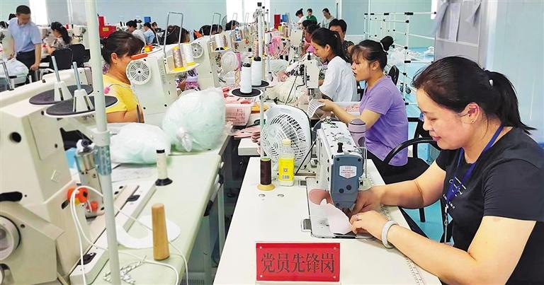 6月30日,湖南省永州市零陵产业开发区晟发鞋业有限公司,“党员先锋岗”员工在忙生产。党员职工立足岗位做表率,敬业奉献勇担当。单建华摄(中经视觉)
