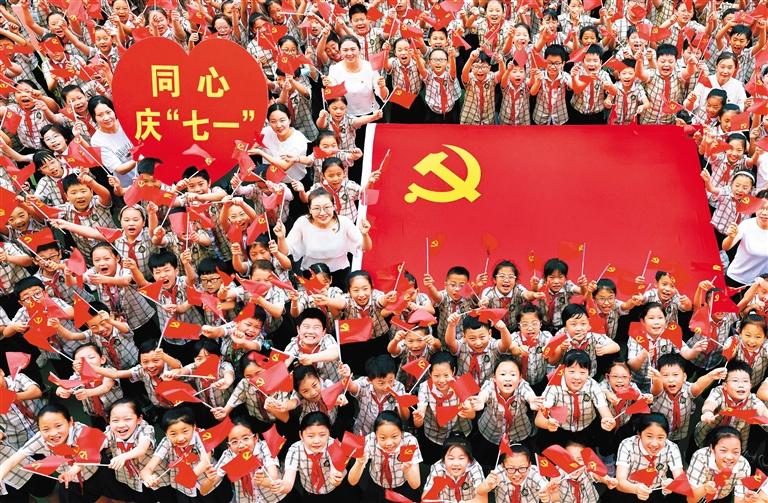 6月22日,山东省枣庄市文化路小学举行“同心庆‘七一’ 喜迎二十大”主题教育活动。师生们唱响《没有共产党就没有新中国》,表达对党的热爱和美好祝福。吉 喆摄(中经视觉)