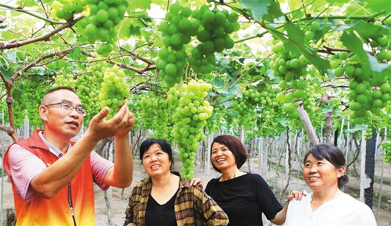 6月29日,江西省宜春市袁州区寨下镇新桃村,党员农技员胡思建(左一)正在向果农传授葡萄管护技术。入夏以来,袁州区党员服务队深入田间地头,为果农及时解决果品生长中的难题,确保丰产高产。邹 忠摄(中经视觉)