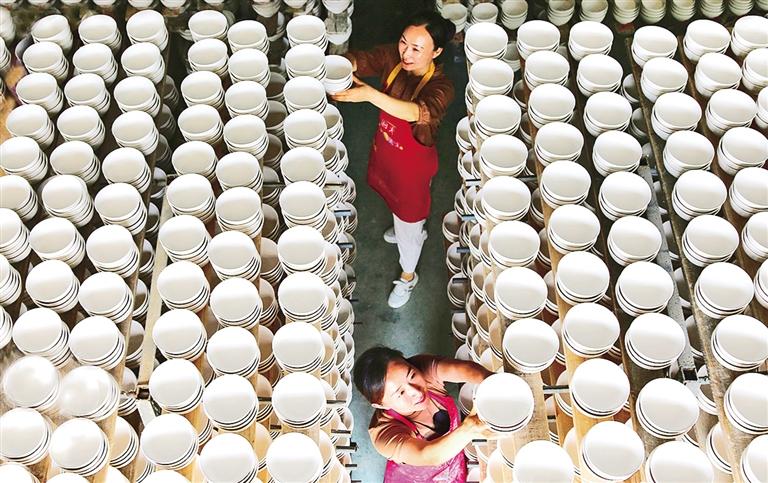 7月1日,江西省宜丰县潭山日用瓷厂车间内员工在晾晒瓷胚。近年来,宜丰县采取内引外联、精细化服务等措施,大力建设日用瓷、木竹、服装等微工厂微车间,为群众在家门口搭建就业平台。 林具如摄(中经视觉)