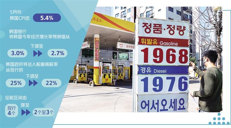 目前,韩国经济面临巨大困难。韩国银行近期将韩国今年经济增长率预测值从3.0%调降至2.7%,而企划财政部给出的预测值更是低至2.6%,这意味着韩国政府对今年韩国经济增长前景更为悲观。相反,韩国5月份的居民消费价格指数(CPI)达到5.4%,创下了20余年的最高值。为有效控制通货膨胀,央行持续调升利率在所难免,但这又会反过来抑制经济增长。在这种情况下,韩国企业界对政府调低法人税率、放松对企业管制的呼声日渐高涨。