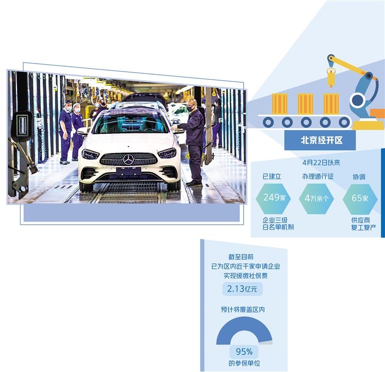 据介绍,4月22日以来,北京经开区已稳妥处置了奔驰、康宁、京东方、拜耳、北生研等企业涉疫风险,保证最小单元不停产;制定了《企业园区疫情防控和生产保障工作方案编制指引》,实现重点企业闭环连续生产;制定了《进口非冷链货物紧急使用工作方案》,保障奔驰等重点企业缓解供应链压力;建立249家企业三级白名单机制,办理通行证4万余个,协调上海等地65家供应商复工复产等。