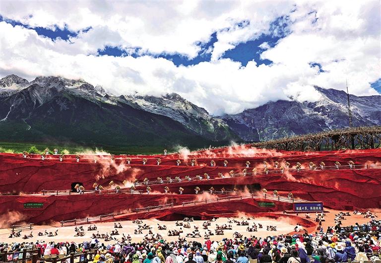 7月5日,游客在云南省丽江市玉龙雪山景区观看原生态大型实景演出《印象·丽江》。连日来,云南各景区景点旅游持续回暖,秀丽壮美的风光吸引八方游客前来观赏。