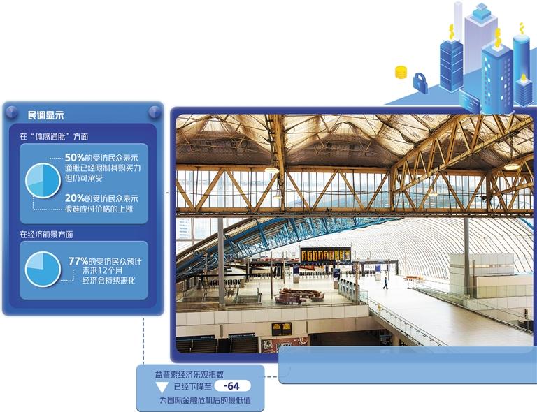 益普索同期进行的民调显示,在当前英国通胀高企的背景下,民众对于经济的悲观预期以及对严重通胀的担忧不断升温。在“体感通胀”方面,50%的受访民众表示,通胀已经限制其购买力但仍可承受;20%的民众则表示,很难应付价格的上涨。在经济前景方面,77%的受访民众预计未来12个月经济会持续恶化,这一比例较5月份上升了5个百分点。益普索经济乐观指数已经下降至-64,为国际金融危机后的最低值。