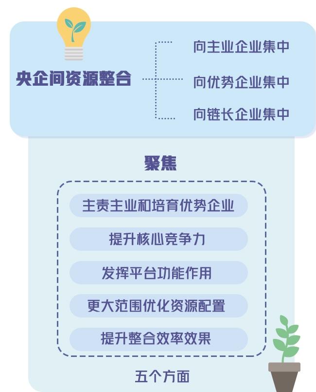 按照部署,央企深化专业化整合,要聚焦主责主业和培育优势企业、提升核心竞争力、发挥平台功能作用、更大范围优化资源配置、提升整合效率效果五个方面。