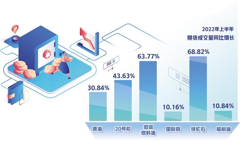 提高重要大宗商品的价格影响力,更好服务和引领实体经济发展。这个期市新时代的任务正在我国率先国际化品种上破题。目前,我国期市已有7个国际化品种:原油期货、20号胶期货、低硫燃料油期货、铁矿石期货、PTA期货、国际铜期货、棕榈油期货。这些国际化投资标的是投资者在海外就可以投资的。“中国平台”吸引全球参与,汇聚世界声音,它们在全球的影响力日益扩大。2022年上半年,原油、20号胶、低硫燃料油、国际铜、铁矿石和棕榈油期货成交量同比分别增长30.84%、43.63%、63.77%、10.16%、68.82%和10.84%。
