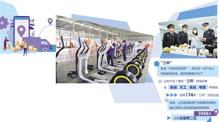 为打通内外贸堵点,山东推进“同线同标同质”工程,推动适用范围由食品行业扩大至一般消费品等领域,促进内外销产品质量标准、认证认可等相衔接。宁津县市场监管局副局长李芳刚告诉记者,宁津县有64家企业开展出口业务,其中健身器材行业出口比例较大,疫情影响国际销售,2020年营业收入同比下降20.17%,利润同比下降33.39%。宁津县市场监管局积极引导当地企业从外销向内销转型,开展“三同”创建,邀请山东省标准化研究院的专家结合国内国际有关标准,为企业量身定制了新的企业标准。他们又聘请第三方认证机构,帮助企业完善质量管理体系,真正做到出口内销产品一个质量标准。目前,宁津健身器材出口到170多个国家和地区,成为国际上主要的商用健身器材生产基地之一。