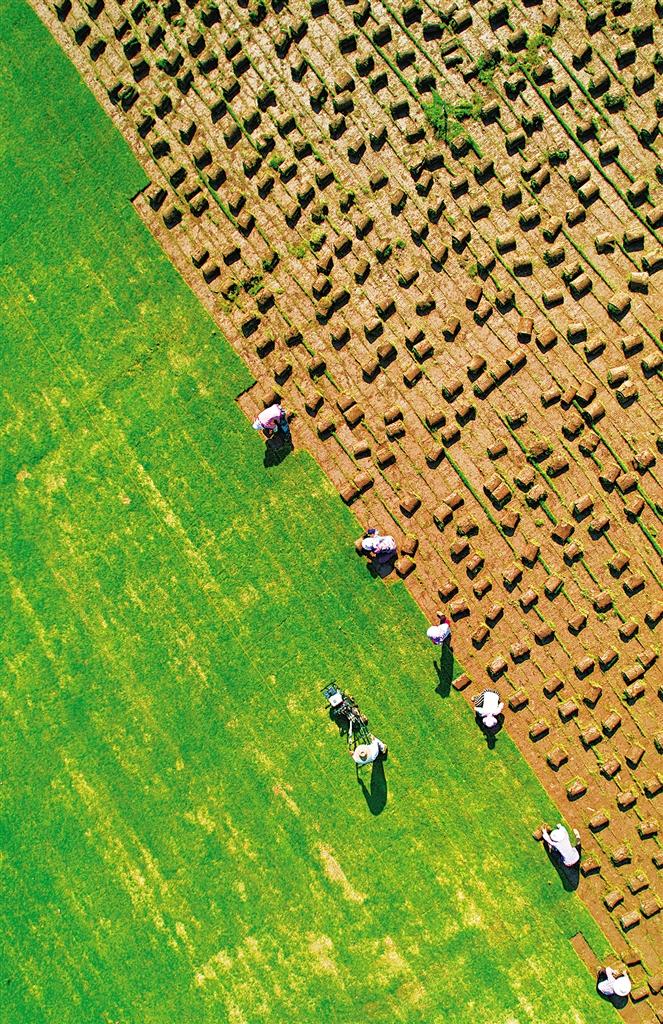七月十四日,安徽省望江县漳湖镇园艺基地,村民正在打包、装运草皮。近年来,当地大力发展绿化草皮种植产业,让绿色的草皮释放出生态红利,今年草皮种植面积超六百亩。江 胜摄(中经视觉)