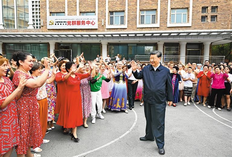 13日上午,习近平来到乌鲁木齐市天山区固原巷社区。该社区少数民族居民占95%以上。习近平走进党群服务中心大厅、爱心之家、舞蹈室、少儿阅览室,同社区居民亲切交流。习近平饶有兴致观看儿童中华优秀传统文化知识表演,他指出,中华优秀传统文化教育抓早抓小、久久为功、潜移默化、耳濡目染,有利于夯实传承中华优秀传统文化的根基。在维吾尔族居民阿布来提·吐尔逊家中,习近平仔细察看客厅、卧室、厨房等,同一家人围坐在一起拉家常。习近平强调,民族团结是我国各民族人民的生命线,新疆各民族都是中华民族大家庭不可分割的成员,要格外珍惜安定团结的大好局面,56个民族拧成一股绳,保持定力、脚踏实地,同心协力、踔厉奋发,在党的领导下为实现第二个百年奋斗目标继续奋斗。习近平指出,社区工作连着千家万户,要充分发挥社区基层党组织的战斗堡垒作用,把工作重心下沉,紧贴各族居民所思所想所盼,帮助大家办好事、办实事、解难题,促进各族群众手足相亲、守望相助,共建美好家园、共创美好未来。