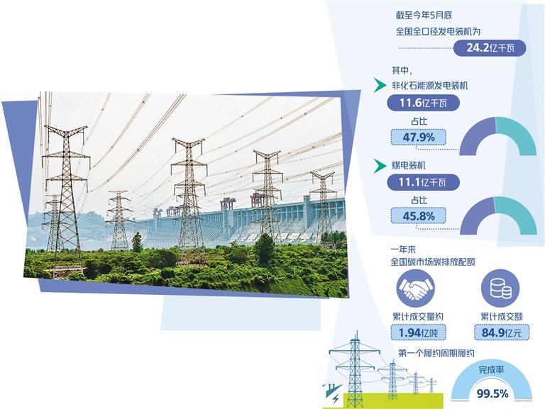据中电联统计,截至今年5月底,全国全口径发电装机为24.2亿千瓦,其中,非化石能源发电装机11.6亿千瓦,占比47.9%,煤电装机11.1亿千瓦,占比45.8%。