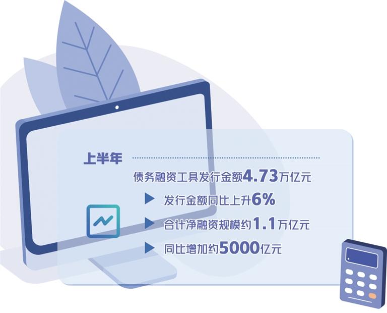 上半年,银行间市场持续加大对实体经济的支持力度。最新数据显示,2022年上半年,债务融资工具发行金额4.73万亿元,发行金额同比上升6%,合计净融资规模约1.1万亿元,同比增加约5000亿元。