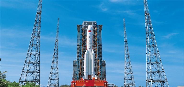 7月18日,问天实验舱与长征五号B遥三运载火箭组合体转运至发射塔架。当日,问天实验舱与长征五号B遥三运载火箭组合体转运至发射区,将于近日择机实施发射。屠海超摄(新华社发)