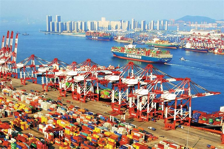 7月18日,山东港口青岛港前湾集装箱码头车船如织,整个港区十分繁忙。今年以来,青岛港依托山东港口一体化发展平台,积极开拓海外市场,航线不断丰富和迭代,上半年新增航线15条,船舶靠离艘次同比增长4.39%。 吴绍洋摄(中经视觉)