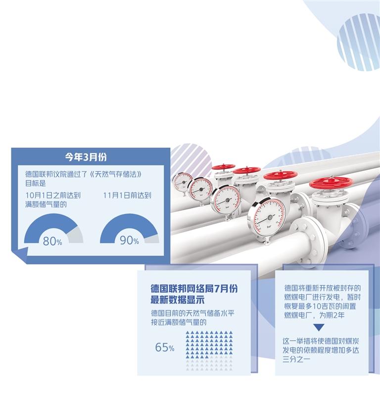 今年3月份,德国联邦议院通过了《天然气存储法》,首次规定在冬季供暖开始时,燃气储存设施必须完全储满,以便安全过冬。其目标是10月1日之前达到满额储气量的80%,11月1日前达到90%。德国联邦网络局7月份的最新数据显示,德国目前的天然气储备水平接近满额储气量的65%。