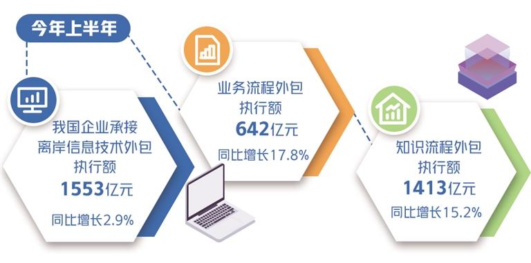 商务部发布的最新数据显示,今年上半年,我国企业承接服务外包合同额9875亿元,执行额6454亿元,同比分别增长12.3%和14.3%。其中,承接离岸服务外包合同额5473亿元,执行额3607亿元,同比分别增长10.7%和10.0%。
