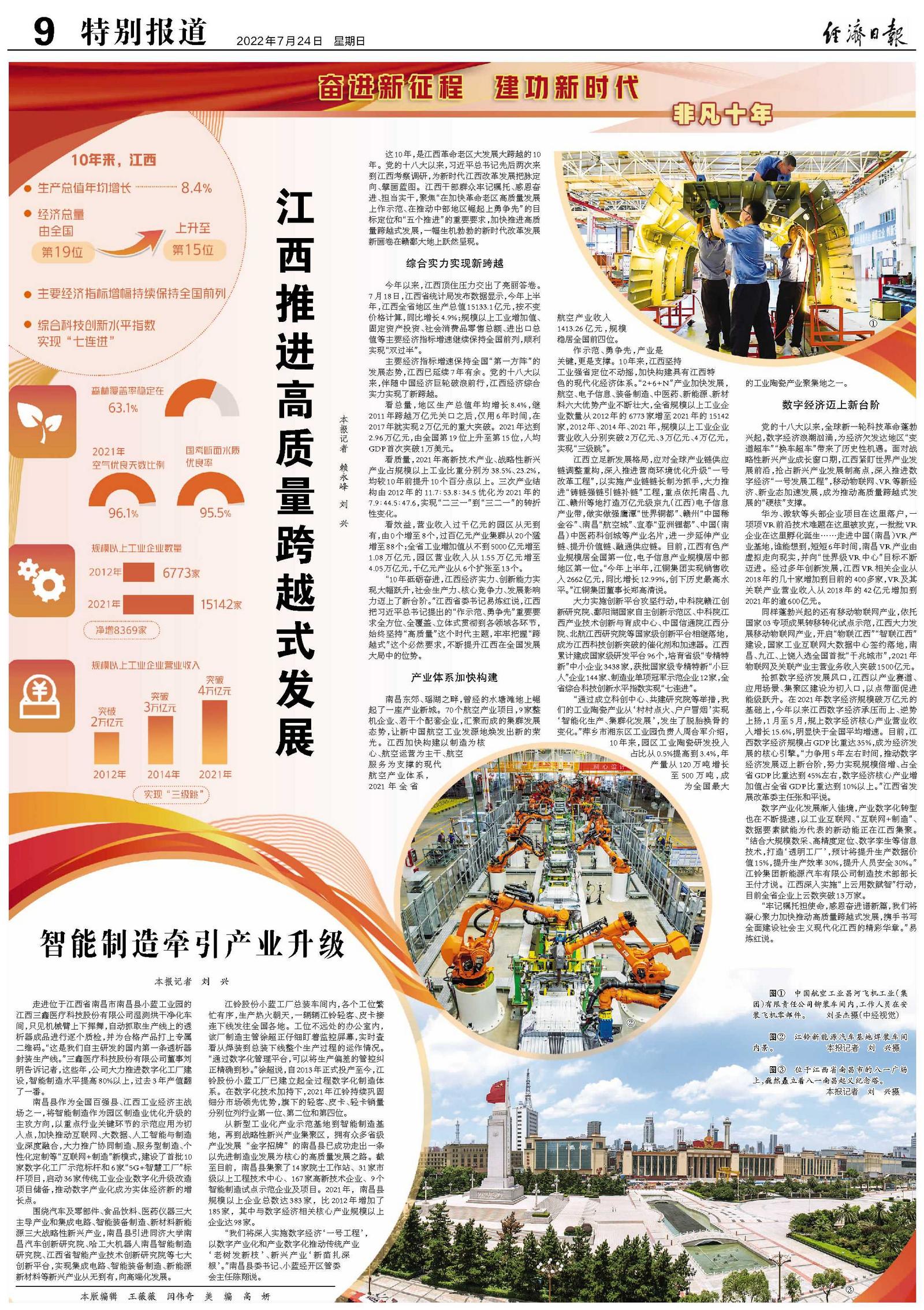作示范、勇争先,产业是关键,更是支撑。10年来,江西坚持工业强省定位不动摇,加快构建具有江西特色的现代化经济体系。“2+6+N”产业加快发展,航空、电子信息、装备制造、中医药、新能源、新材料六大优势产业不断壮大,全省规模以上工业企业数量从2012年的6773家增至2021年的15142家,2012年、2014年、2021年,规模以上工业企业营业收入分别突破2万亿元、3万亿元、4万亿元,实现“三级跳”。