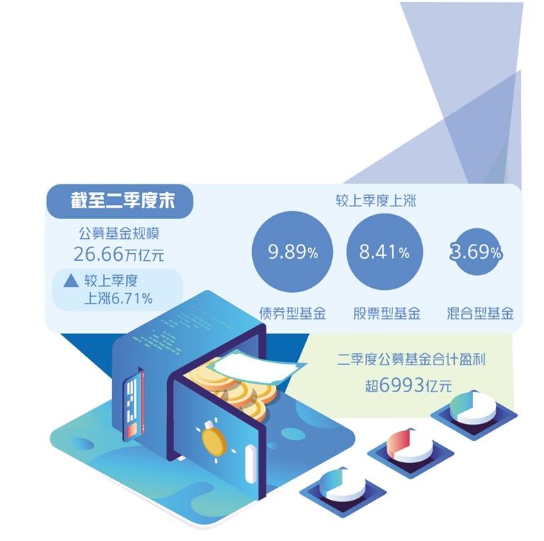 Wind数据显示,截至二季度末,公募基金规模达26.66万亿元,较上季度上涨6.71%。除另类投资基金以外,各类型基金规模均有所上涨。其中,债券型基金较上季度上涨9.89%,股票型与混合型基金规模较上季度分别上涨8.41%和3.69%。同时,二季度公募基金合计盈利超6993亿元,其中股票型与混合型基金本季度净利润分别为1668亿元、3731亿元。