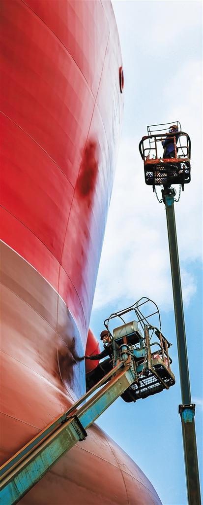 ▼广东中远海运重工员工在为巨轮涂装。今年上半年,该公司订单充足,新船型研发和交付快速推进。付海燕摄(中经视觉)