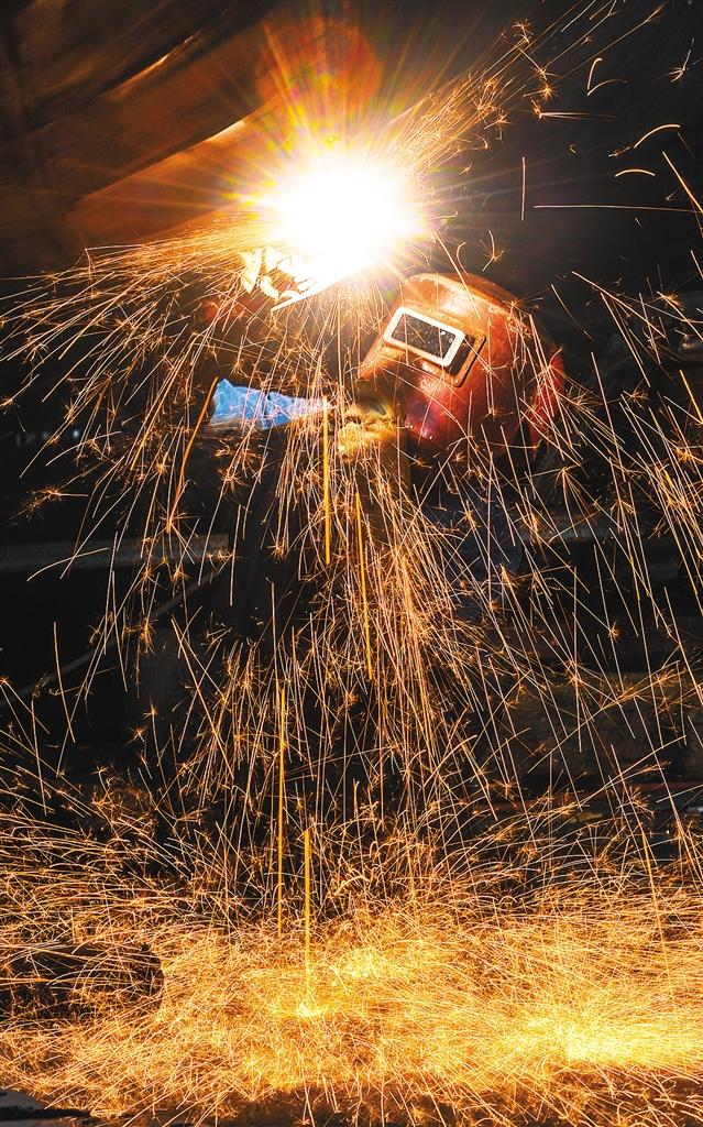 ▼位于浙江省温岭市松门镇礁山港的浙江腾龙造船有限公司,工人在焊接船舶主体,赶制生产订单。刘振清摄(中经视觉)