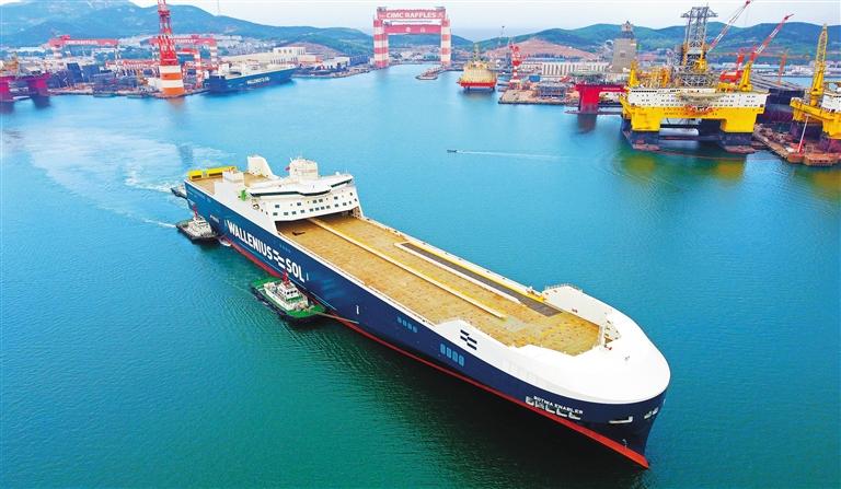 ◀由中集来福士海洋工程有限公司为瑞典设计建造的全球最大的双燃料冰级滚装船在山东省烟台市交付并起航。今年1月份至6月份,我国造船完工量、新接订单量、手持订单量,国际市场份额均居世界第一。唐 克摄(中经视觉)