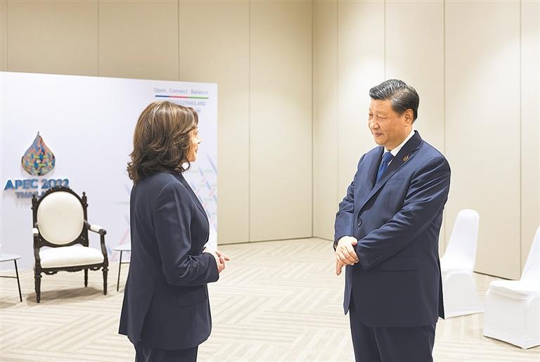 当地时间11月19日,国家主席习近平在曼谷出席亚太经合组织领导人非正式会议期间,应约同美国副总统哈里斯简短交谈。