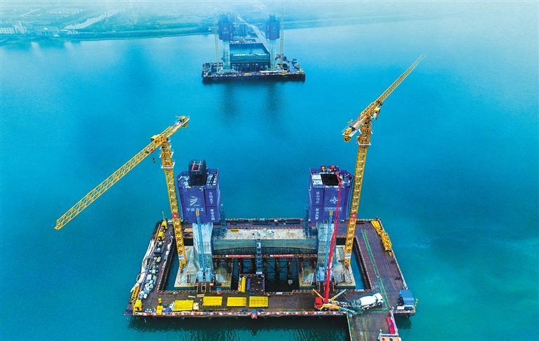 近日,工人在浙江宁波舟山港六横公路大桥一期工程项目塔柱施工。该大桥作为甬舟一体化的重要纽带,建成后将连接宁波舟山港六横和梅山两大核心港区,对促进长三角一体化具有重要意义。胡学军摄(中经视觉)