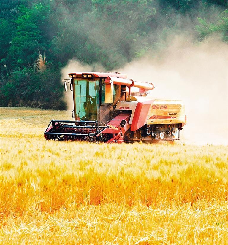 4月12日,云南省红河哈尼族彝族自治州弥勒市西三镇戈西村委会田园一片金黄,大麦成熟迎来收割期,农民用收割机开镰收割,确保颗粒归仓。 普佳勇摄(中经视觉)