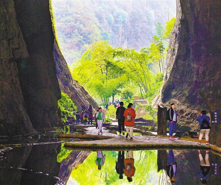 ▶4月12日,重庆市酉阳县桃花源景区吸引八方游客。酉阳县不断拓展景区景点绿地面积,让游客在“绿”中观景,放飞心情。